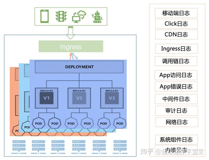 - 日志的种类变多,上图是一个典型的Kubernetes架构,一个请求从客户端需要经过CDN、Ingress、Service Mesh、Pod等多个组件,涉及多种基础设施,其中的日志种类增加了很多,例如K8s各种系统组件日志、审计日志、ServiceMesh日志、Ingress等。