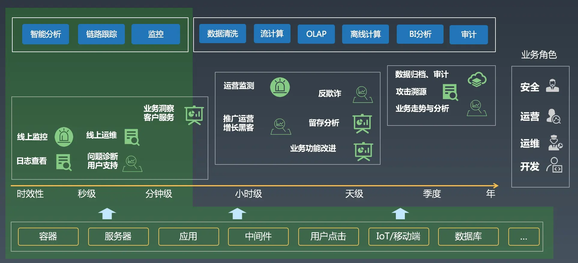 在阿里,几乎所有的业务角色都会涉及到各式各样的日志数据,为了支撑各类应用场景,我们开发了非常多的工具和功能:日志实时分析、链路追踪、监控、数据加工、流计算、离线计算、BI系统、审计系统等等。日志系统主要专注于数据的实时采集、清洗、智能分析与监控以及对接各类各样的流计算、离线系统。