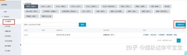 由于 API 需要归属分组,我们首先创建分组。登录阿里云API 网关控制台,开放API->分组管理: