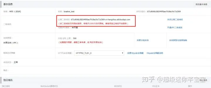 创建完成之后,我们需要在分组详情中开启公网域名,以进行公网服务访问:可以通过 1 开启公网二级域名进行测试,或者通过 2 设置独立域名。