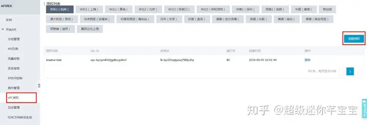 点击【创建授权】,设置VPC Id以及内网SLB实例Id。这里创建 knative-test VPC 授权