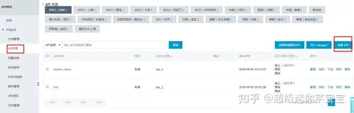 登录阿里云API 网关控制台,开放API->API列表,选择【创建API】。关于创建API,详细可参考:创建API。