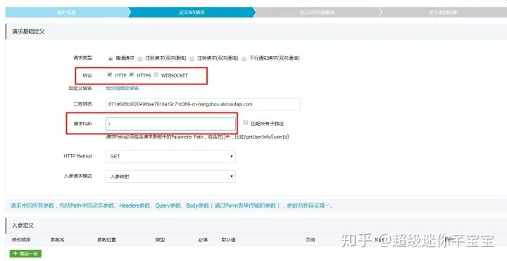 点击下一步,定义API请求。协议可以选择HTTP和HTTPS, 请求Path可设置/。