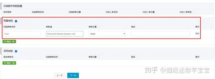 设置常量参数,其中后端参数名称:Host,参数值:helloworld.default.example.com,参数位置:Header。