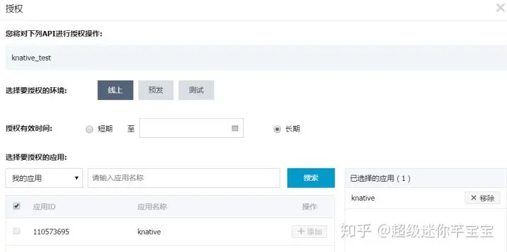 点击【添加授权】,这里我们选择上面创建的knative应用进行授权