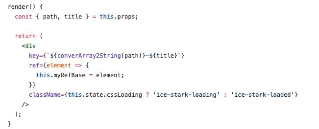 getMountNode 方法返回了 window.ICESTARK.root,这个值在 AppRoute 组件中的 renderChild 方法中被初始化赋值 setCache('root', rootElement),rootElement 的值为 AppRoute 组件的方法 appendElementToBase 的返回值 document.createElement('div'),这个 element 的 id 被赋值为 AppRoute 的 props.rootId,默认值为 icestarkNode,这个 element 被 append 进 AppRoute 的容器中 render = () => <div ref={el => this.myRefBase = el} />;