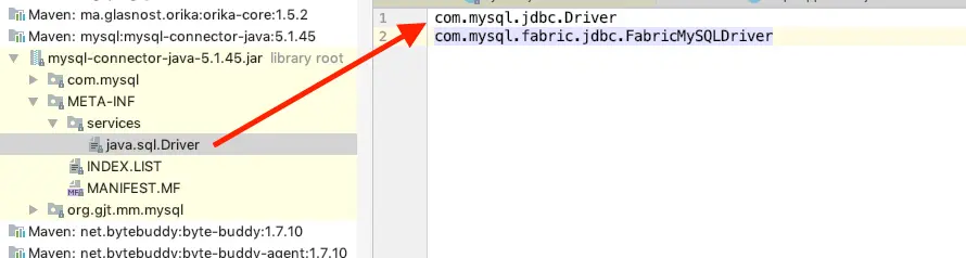 - spi机制。全称service provider interface,服务提供发现机制,就比如:jdk中的sql包中Driver接口对应的mysql中提供的服务配置如下:
