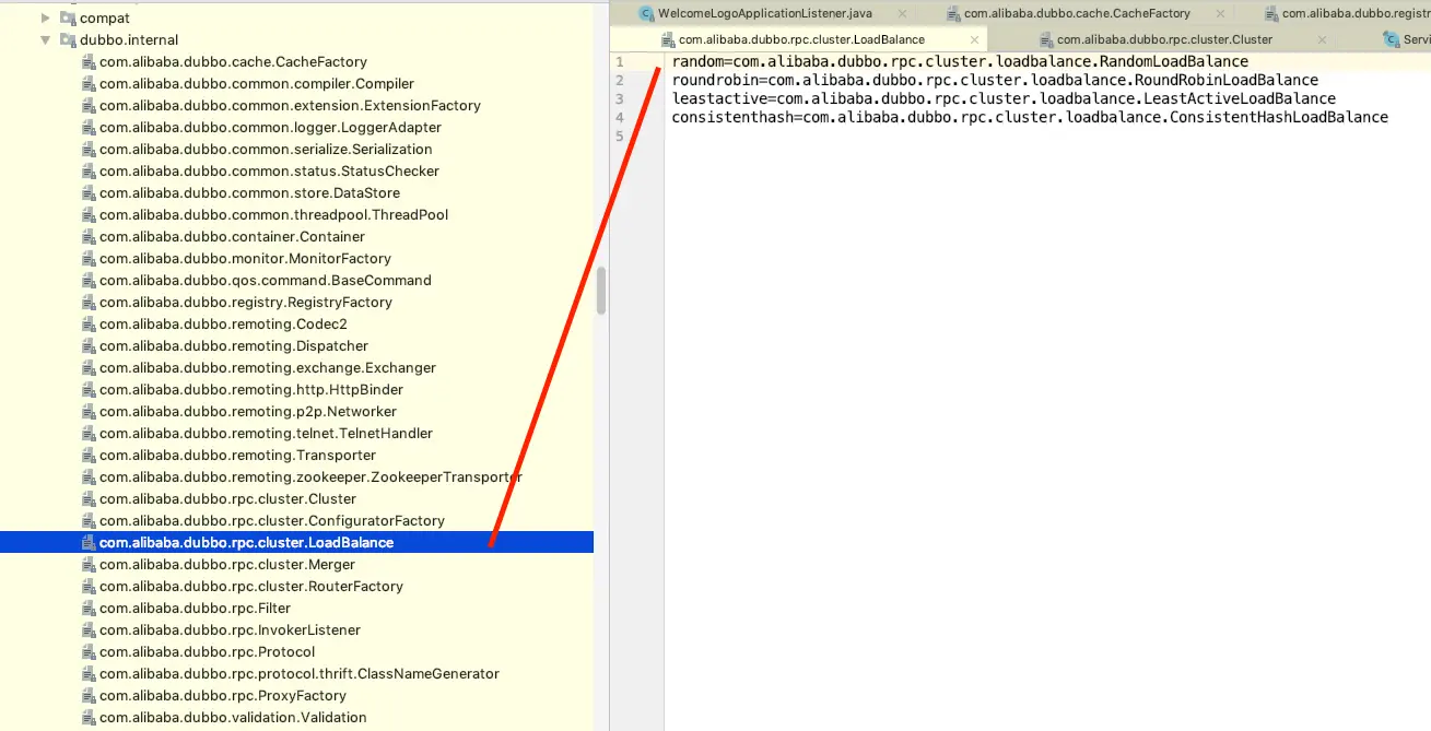 在dubbo中也有对应的spi机制,给出一个负载均衡的例子具体可以参考dubbo官网
