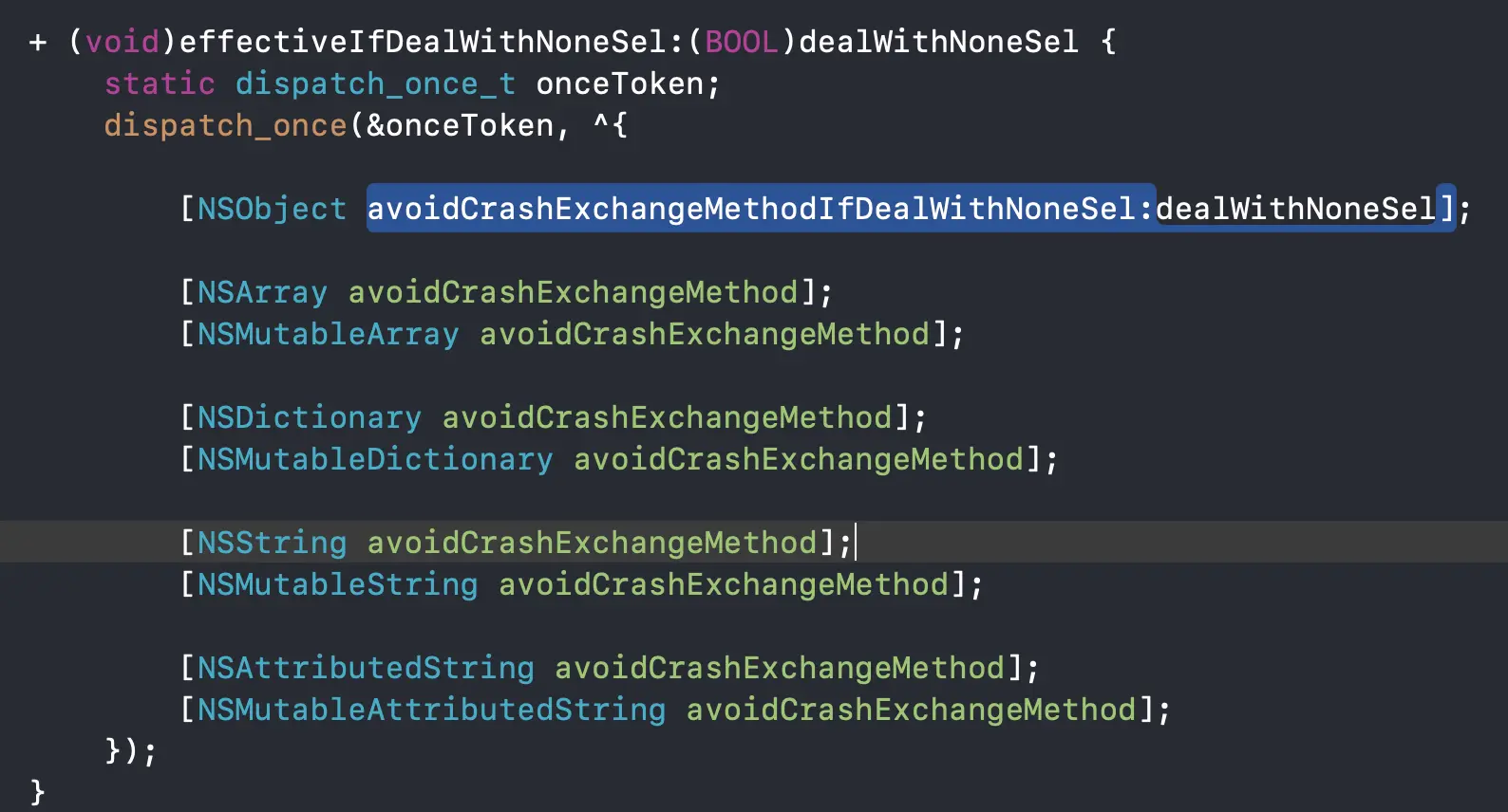 如图主要是数组、字典、字符串、NSObject(KVC、unrecognized selector sent to instance)。可以看到AvoidCrash在初始化时有以下操作: