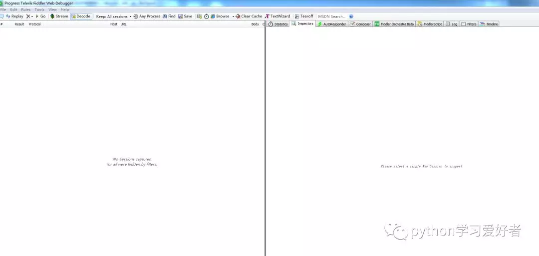 然后我们打开fiddler工具(本文假定读者已安装fiddler并已正确修改配置, 如未安装请百度fiddler前往官网安装最新版本):