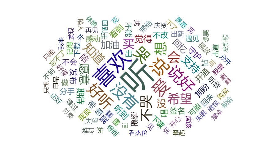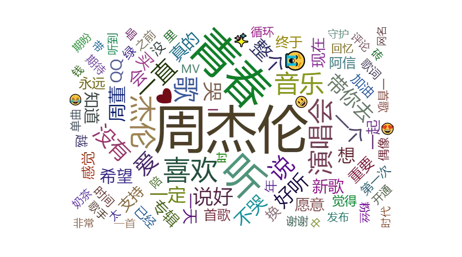 歌迷们对于“周杰伦”的呼喊声是最高的,同时“青春”、“喜欢”、“音乐”,“演唱会”等词语的出现频率也非常高。