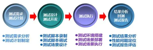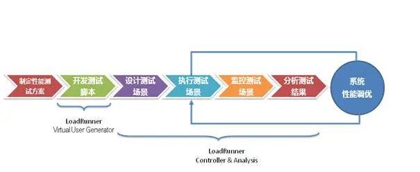 制定性能测试计划→开发测试脚本→设计测试场景→执行测试场景→监控测试场景→分析测试结果