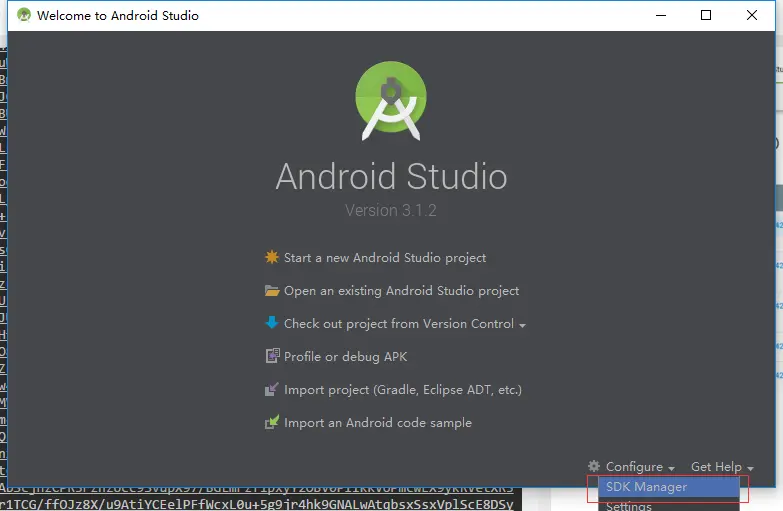 如果下载的是.zip安装包,解压后通过安装目录下bin下的studio64.exe即可打开Android Studio,在欢迎界面中选择Configure|SDK Manager: