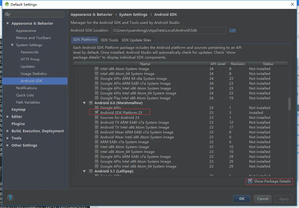 在SDK Platforms窗口中,选择Show Package Details,然后在Android 6.0 (Marshmallow)中勾选Android SDK Platform 23