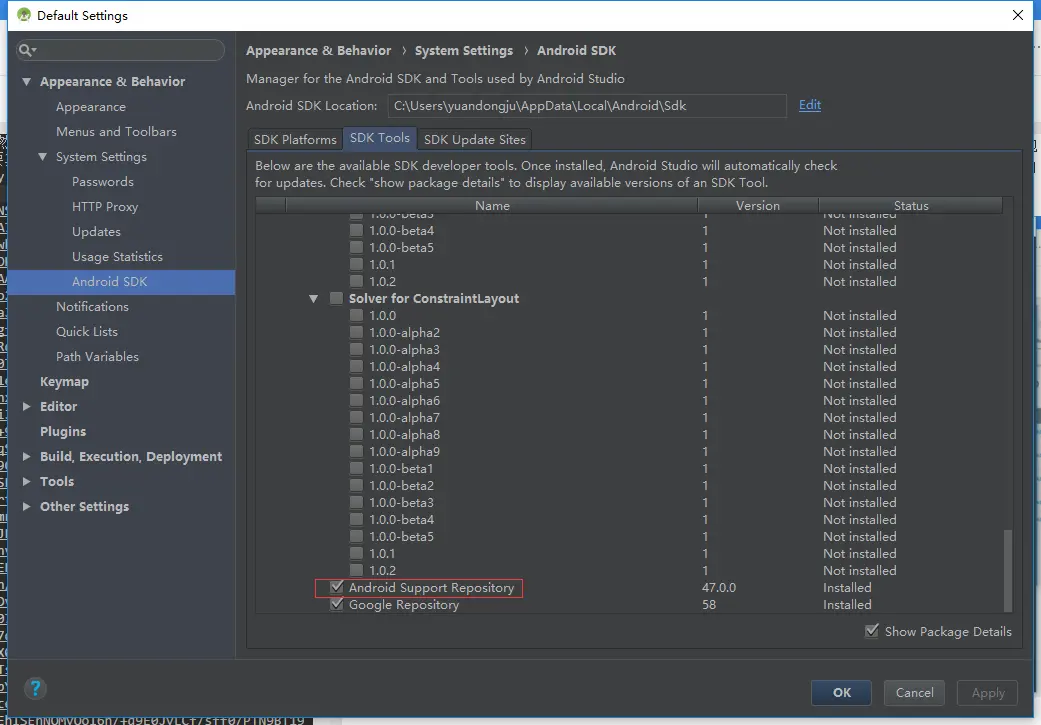 在SDK Tools窗口中,选择Show Package Details,然后在Android SDK Build-Tools中勾选 23.0.1(必须包含有这个版本。当然如果其他插件需要其他版本,你可以同时安装其他多个版本)。然后还要勾选最底部的Android Support Repository.
