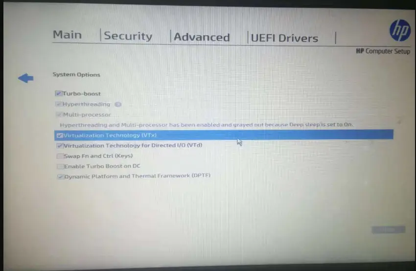 4.开机时长按F10 开启BIOS设置,在Advanced里找到 system options 回车,最后勾选了Virtualizaton Technology这两个就开启虚拟化功能了