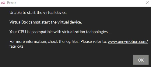 3.点击Genymotion图标,Genymotion启动前会先启动虚拟机,如果出现下图报错,说明电脑默认虚拟化技术的配置项没有开启,需进入BIOS修改配置项。