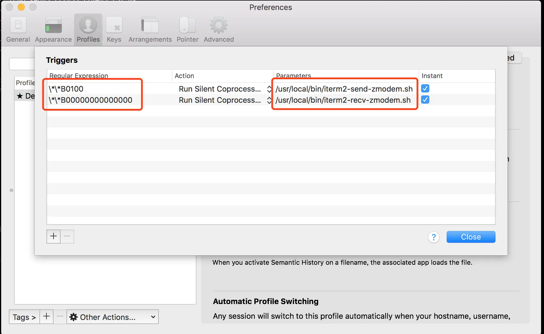 Regular expression Action Action **B0100 Run Silent Coprocess /usr/local/bin/iterm2-send-zmodem.sh **B00000000000000 Run Silent Coprocess /usr/local/bin/iterm2-recv-zmodem.sh -