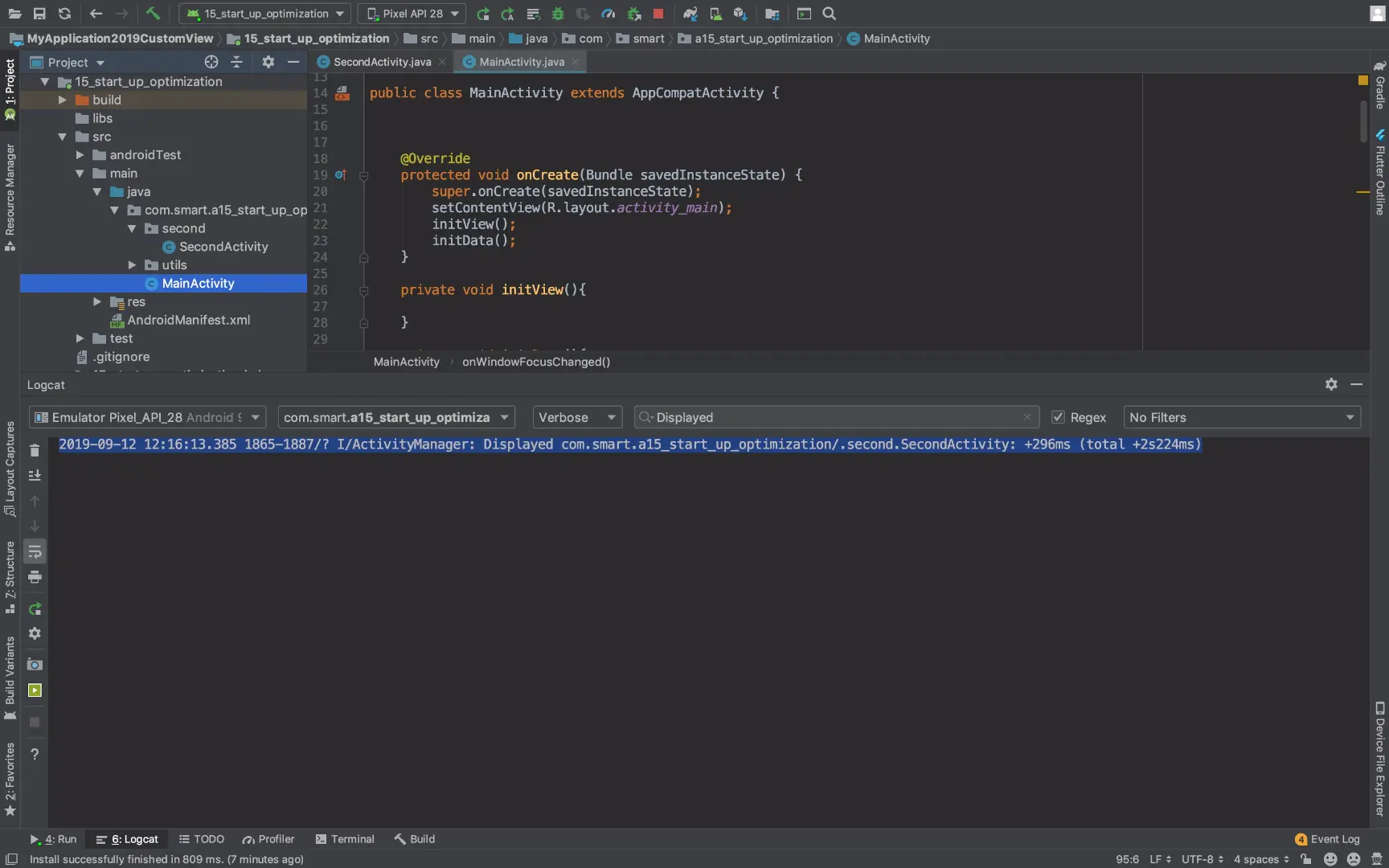 2019-09-12 12:16:13.385 1865-1887/? I/ActivityManager: Displayed com.smart.a15_start_up_optimization/.second.SecondActivity: +296ms (total +2s224ms)