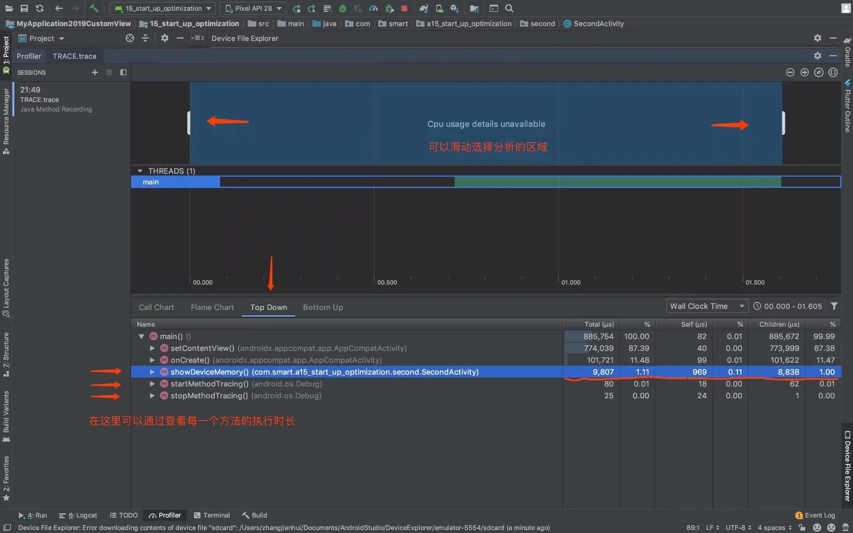 2019-09-12 14:01:53.745 1865-1887/? I/ActivityManager: Displayed com.smart.a15_start_up_optimization/.MainActivity: +885ms