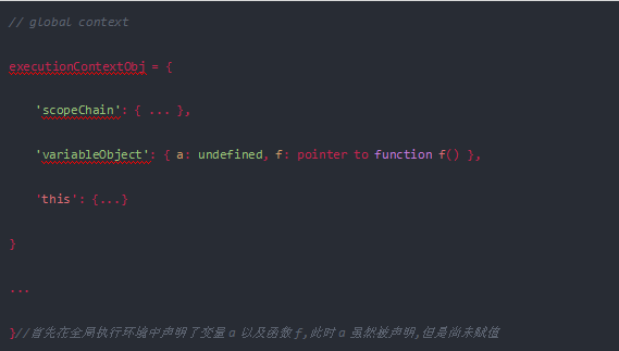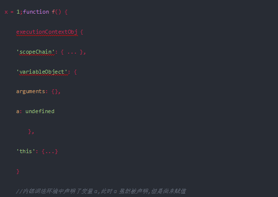 正是由于以上的处理,产生了大家熟知的JavaScript中的变量提升,具体以上代码的执行过程如以下伪代码所示: