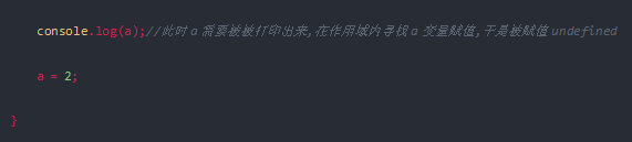 我们可以明显看到,a变量在预解释阶段已经被赋值undefined,在执行阶段js是自上而下单线执行,当console.log(a)执行之时,a=2还没有被执行,a变量的值便是预处理阶段被赋予的undefined,