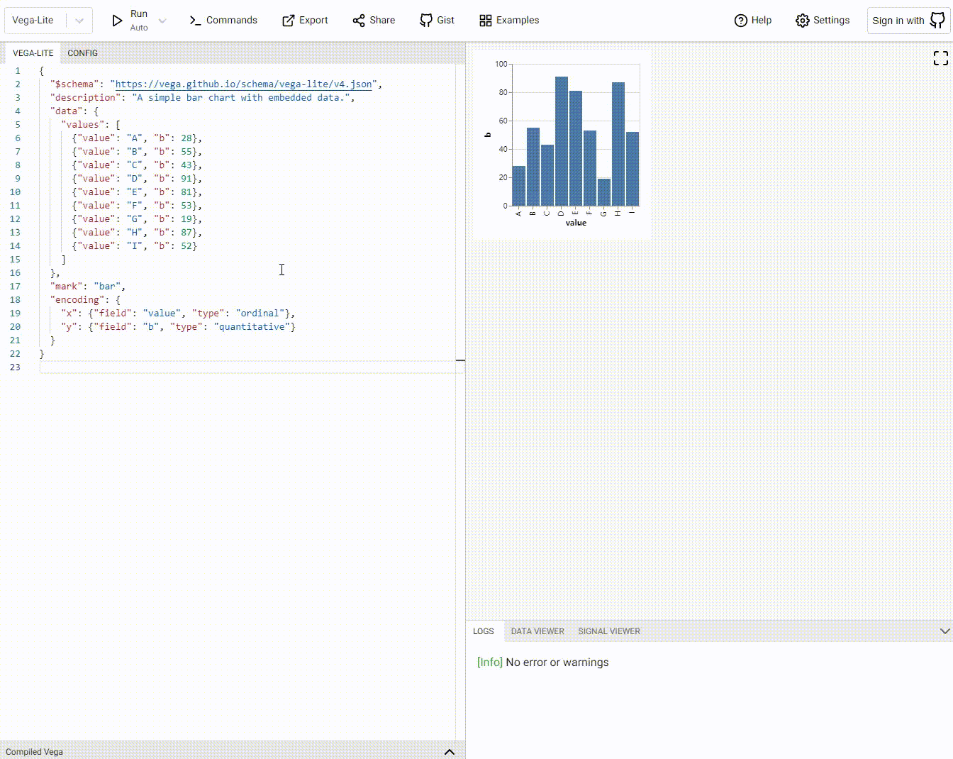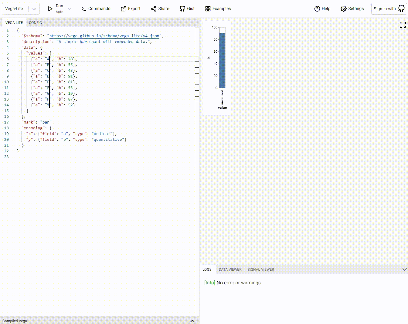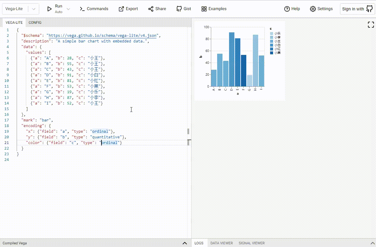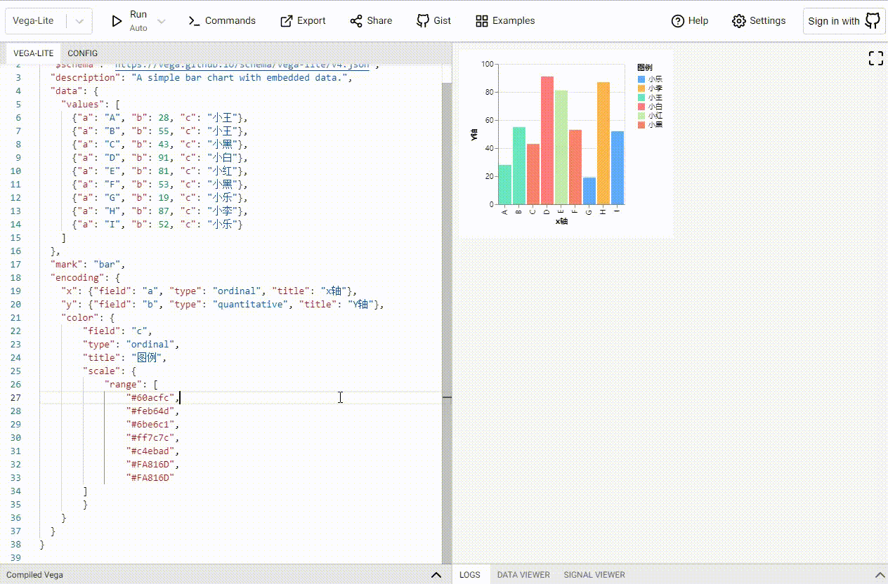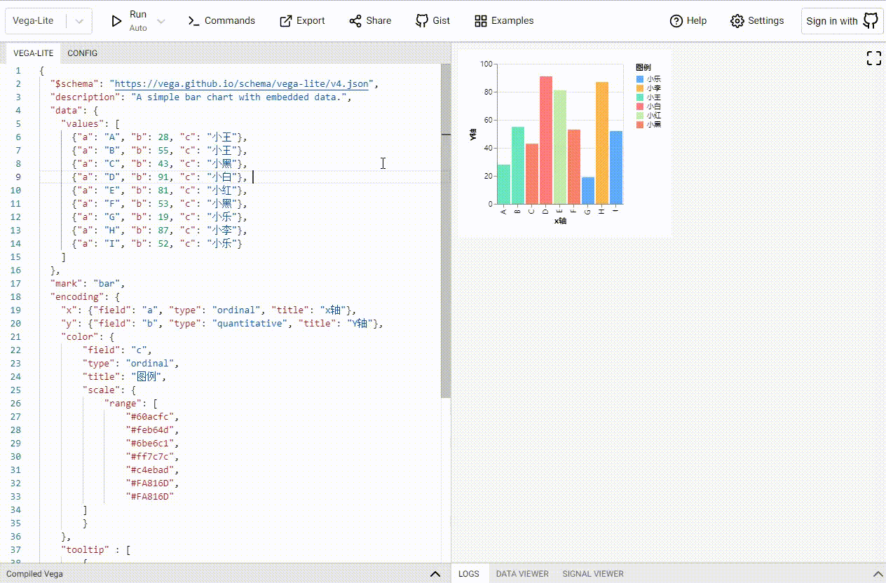 下面我们把这份配置放入Vega编辑器中做一些修改配置项示范,帮助大家了解对应的配置项该如何使用
