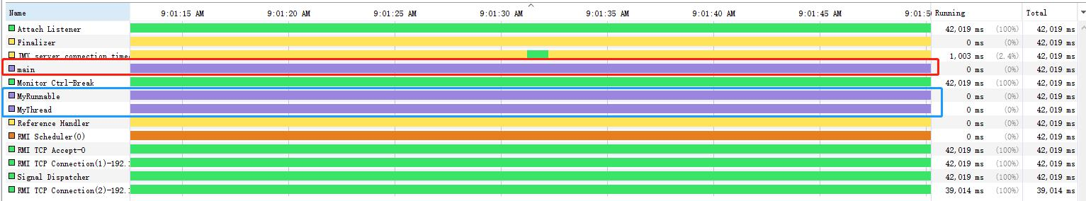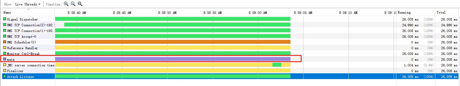 从结果看出只是串行的,但看不出没有线程,我们看下面例子来验证直接调用 run() 方法没有创建新的线程,使用 VisualVM 工具来观察线程情况。