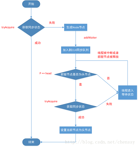 - acquire(int arg):独占式获取同步状态。如果当前线程获取同步状态成功,则由该方法返回;否则,将会进入同步队列等待。该方法将会调用可重写的 #tryAcquire(int arg) 方法;不响应中断