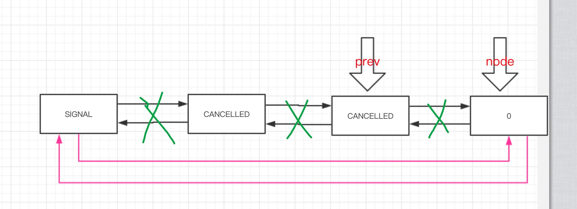 但是,为何是从 tail 尾节点开始,而不是从 node.next 开始呢?原因在于,取消的 node.next.next 指向的是 node.next 自己。如果顺序遍历下去,会导致死循环。所以此时,只能采用 tail 回溯的办法,找到第一个( 不是最新找到的,而是最前序的 )可用的线程。