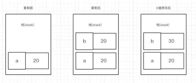 //栈存储,栈里存了个a 20,将a的值赋值给b,此时栈里存了a 20, b 20,然后改变b的值为30,此时栈里存的是a 20,b 30