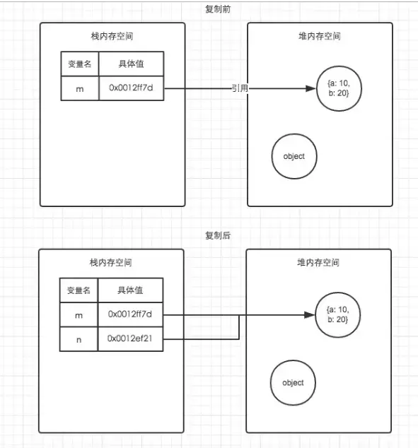 n.a = 20;console.log(m,n) // {a: 20, b: 20,} {a: 20, b: 20}