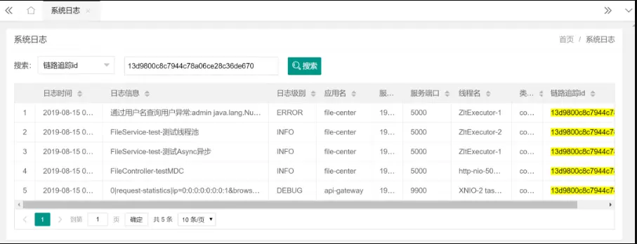当系统出现异常时,可直接通过该异常日志的traceId的值,在日志中心中询该请求的所有日志信息