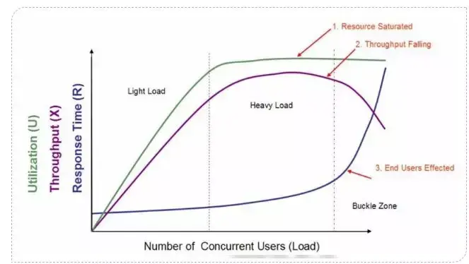 下降阶段(Buckle Zone):TPS随着负载的增加而下降,用户的等待时间快速延长。