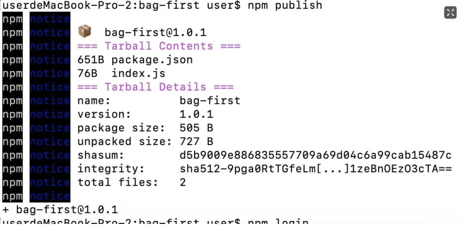 userdeMacBook-Pro-2:bag-first user$ npm login