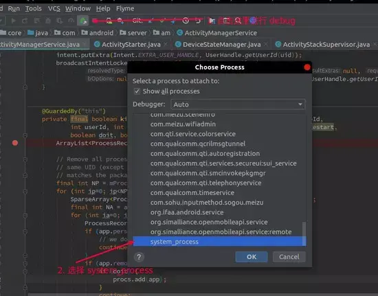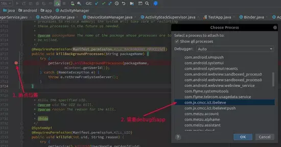 1.首先对源码进行 debug , 首先在 Android 中点击 debug 按钮 , 选择 system_process 这个进程(就是我们所说的 SystemServer) , 然后点击 OK . 代码的断点我们打在上面列出的 ActivityManagerService.killBackgroundProcesses 方法里面。