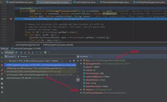 为了进一步调查,我们对这个 app 进行 debug , 由于没有源码,我们直接把断点打到 android/app/ActivityManager.killBackgroundProcesses 这里(因为这里是客户端代码 , 所以调试 App 进程的时候 , 可以直接打断点 )。