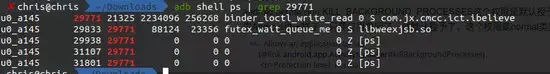 查看 7289 , 确定就是 com.jx.cmcc.ict.ibelieve 这个进程 . 也就是 和我信 这个 App(瘤子)。