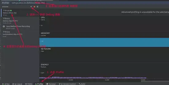 打开 Android Studio , 点击 Profiler 按钮 , 点击 + 号 , 选择 com.jx.cmcc.ict.ibelieve 这个进程 , 然后点击 CPU 这一栏。