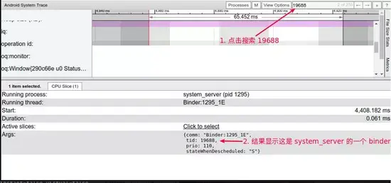 在 Systrace 中搜索 19688 , 可以看到是 Binder:1295_1E , 1295 就是 SystemServer。