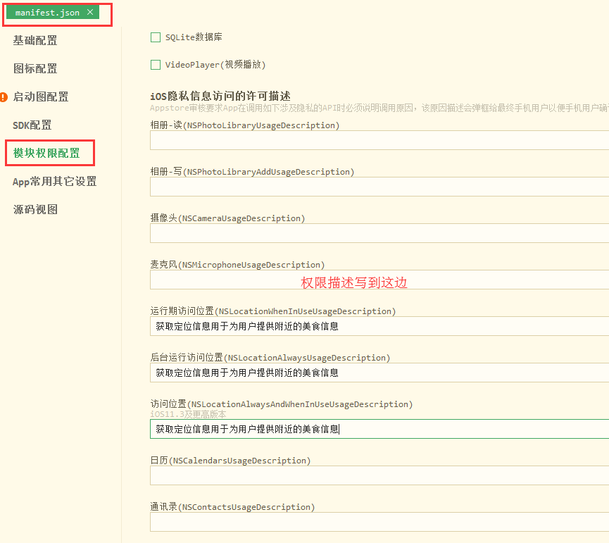 意思就是没有对请求的相关权限进行描述,或者描述的不够准确,比如使用到了定位,相册相机,通讯录等权限,要把为什么使用这些权限做下详细描述!