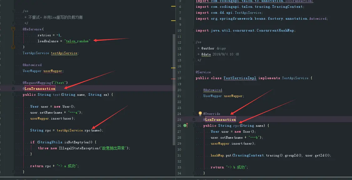 1.在消费者和提供者方法上都添加上@LcnTransaction注解。