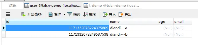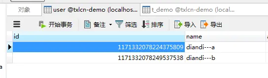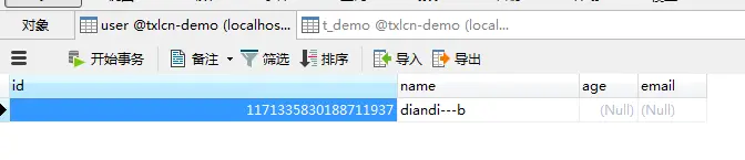 3.带上ex参数。项目抛出异常。然后查看数据是否提交(回滚)。发现数据没有改变。说明分布式事务Lcn模式使用成功。