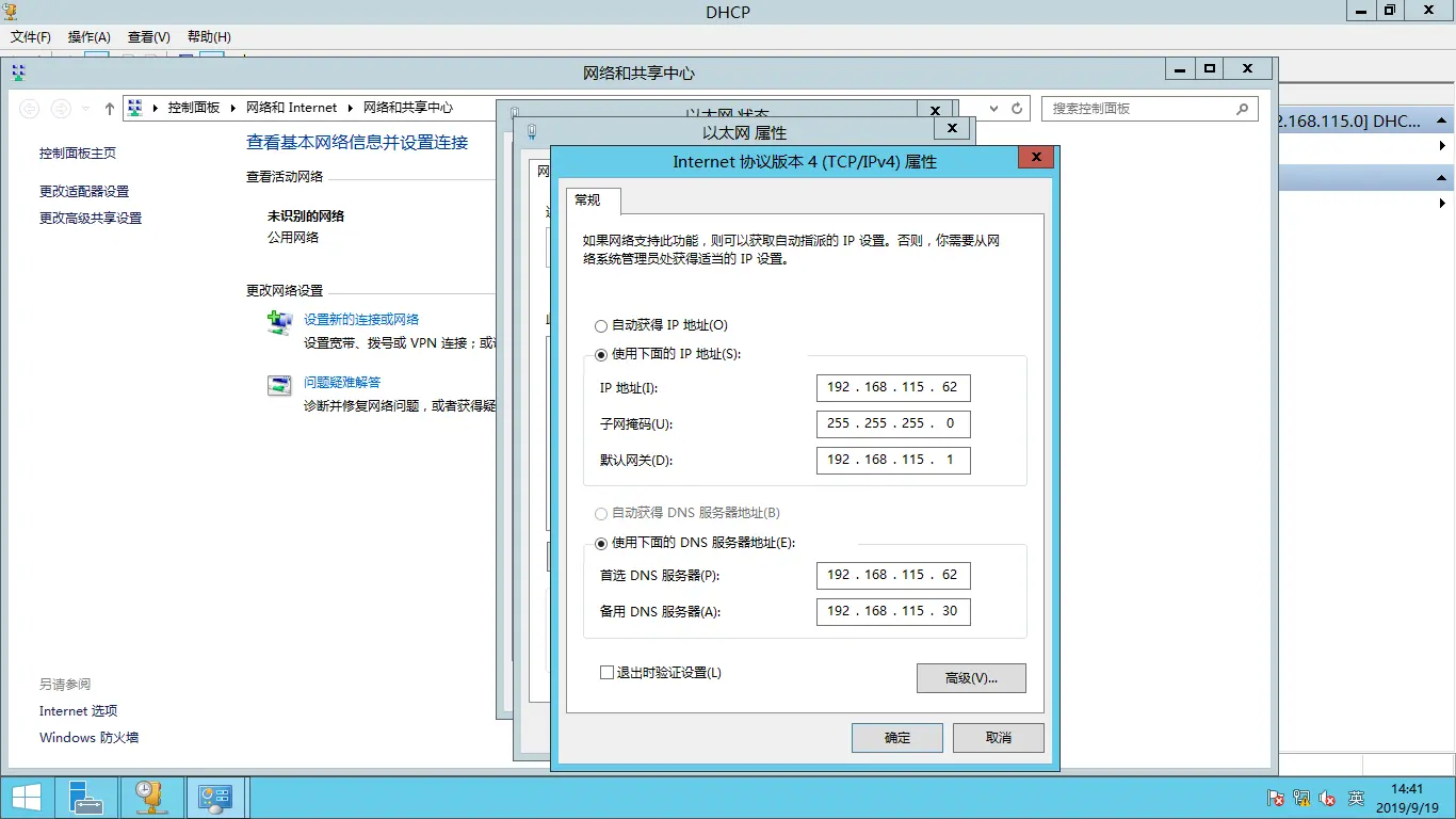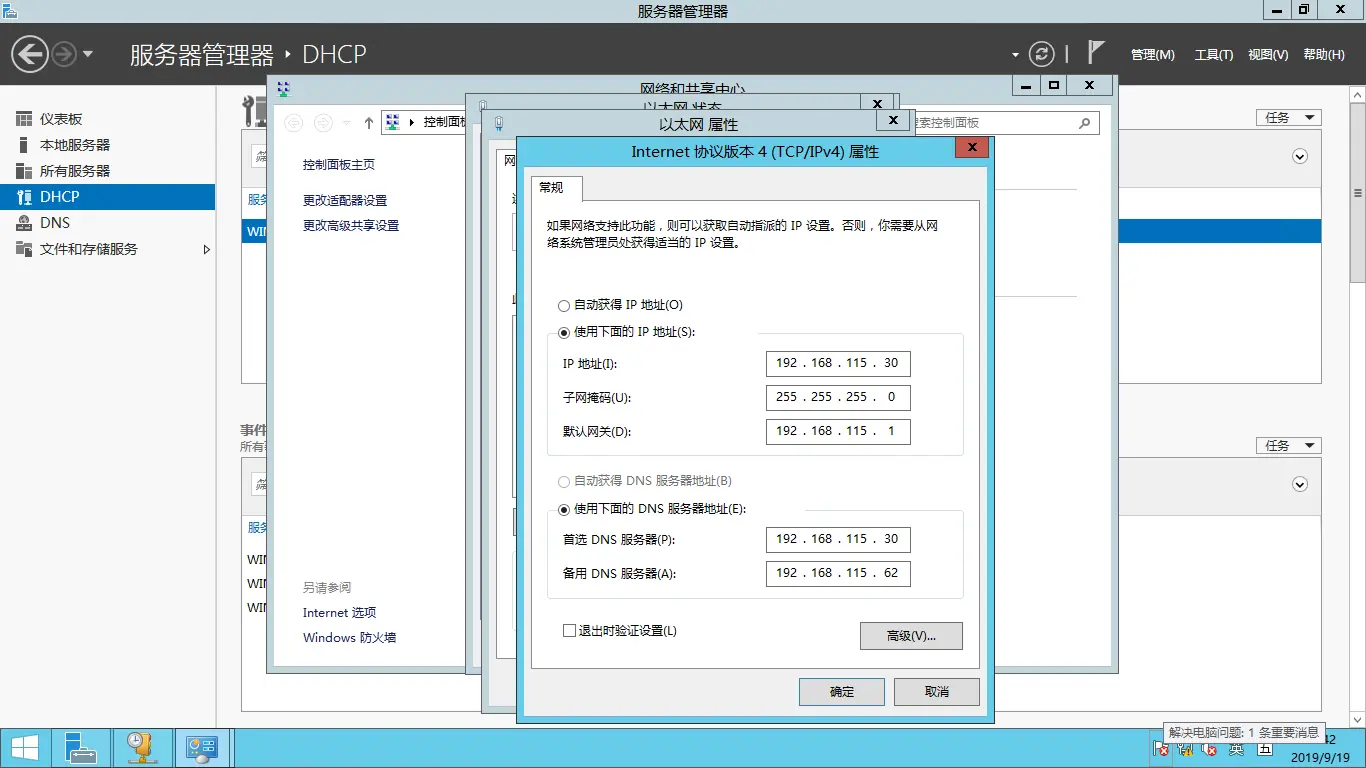 打开一台windows7虚拟服务器 自动获得ip,手动配置DNS服务器地址