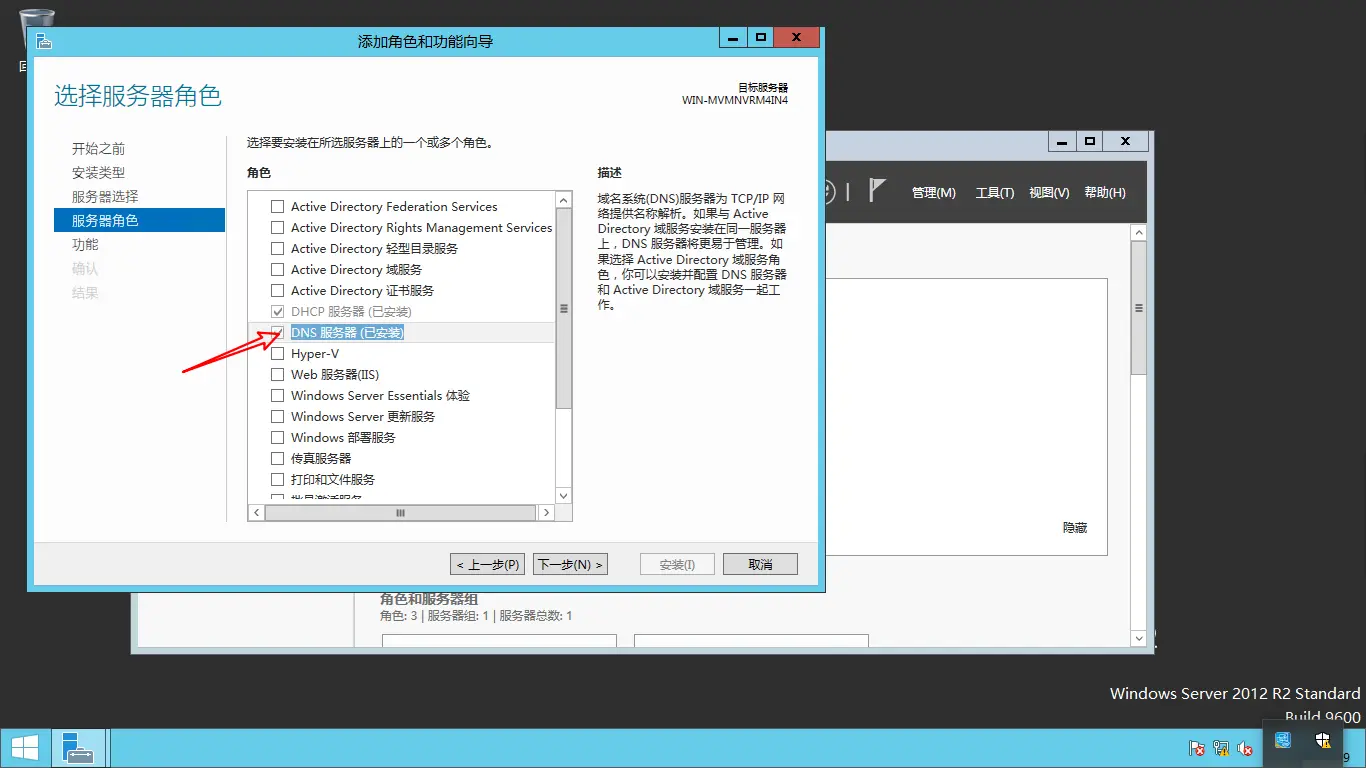 把DNS服务器勾上,其他都默认,直接点击下一步就好了(我这里是已经安装过了)