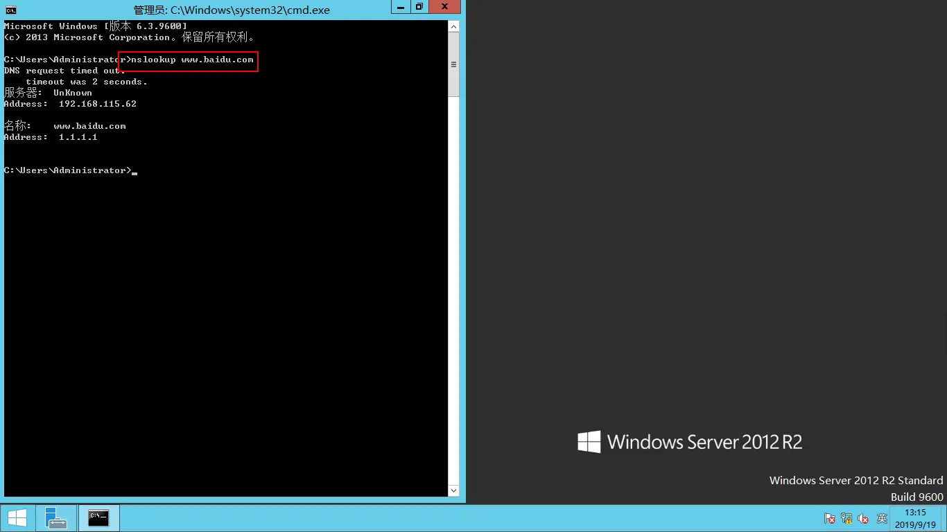 打开命令提示符窗口用nslookup命令测试是否成功,下面表示主DNS服务器配置成功