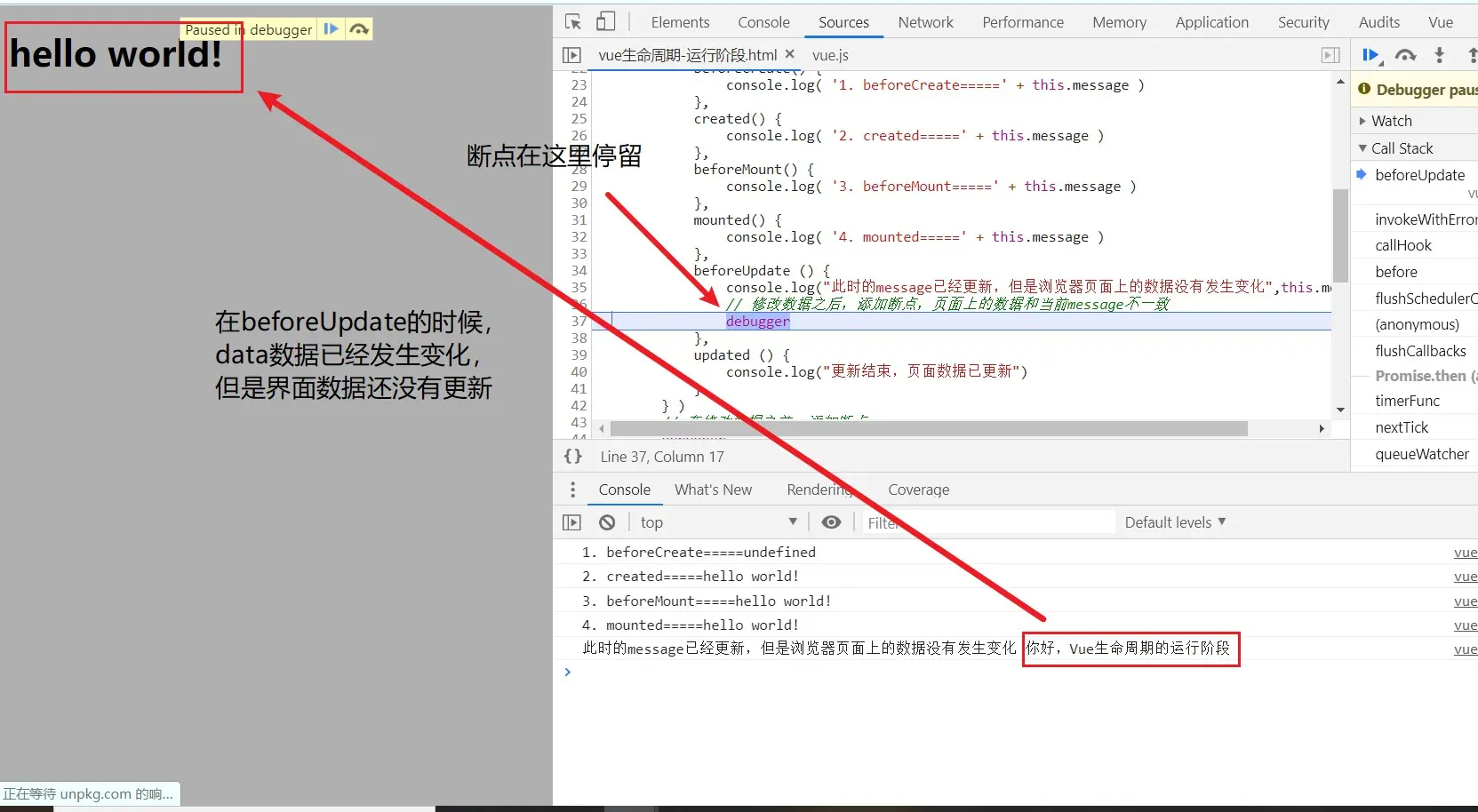 debugger关键字来达到断点调试的功能,每一个debugger就相当于一个断点 - 添加断点调试后,我们可以查看每一个生命周期阶段的数据变化以及查看浏览器渲染时间