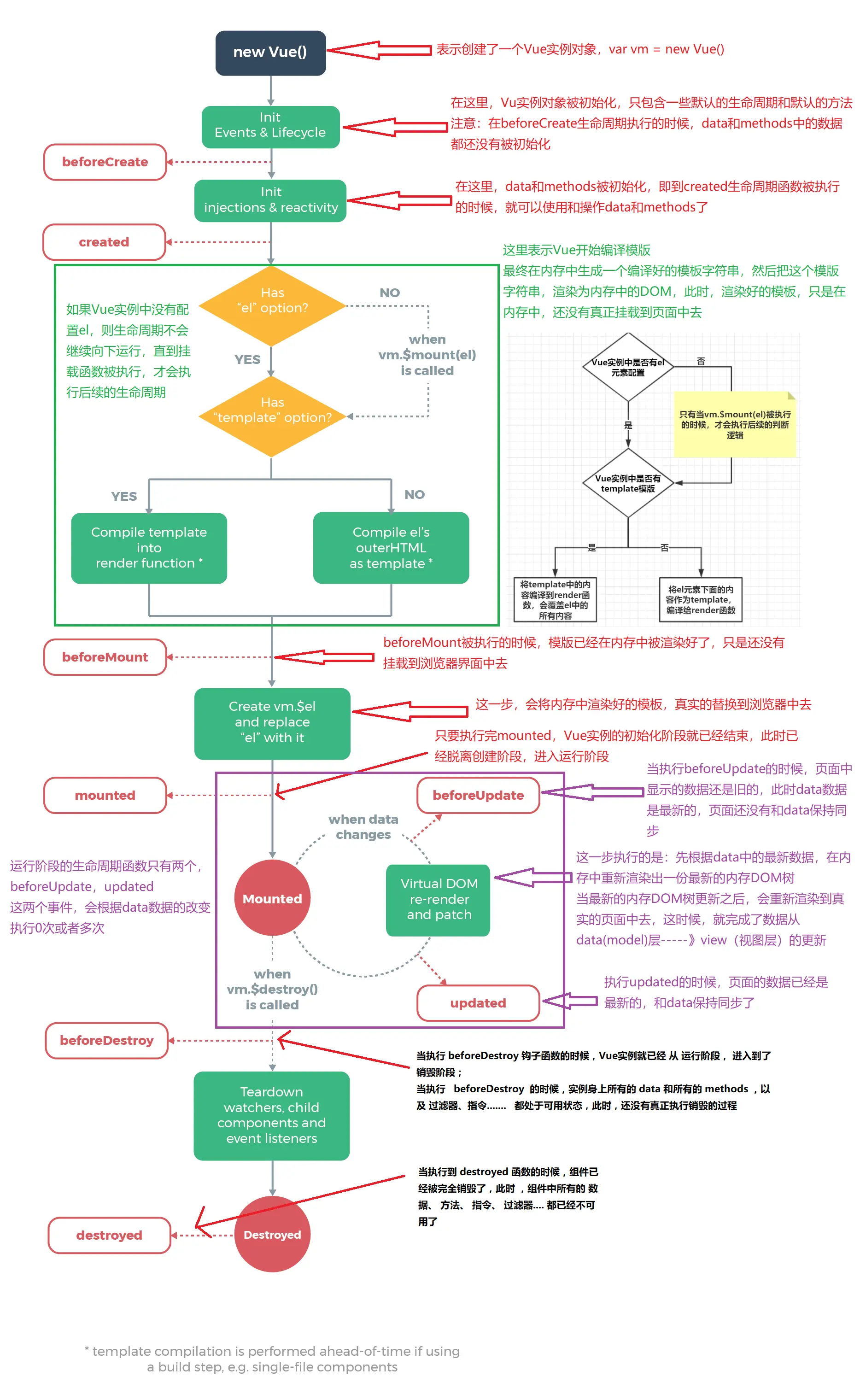 - beforeMount: 此时已经完成了模版的编译,只是还没有渲染到界面中去