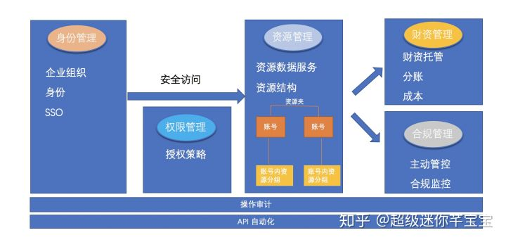 和资源管理平行的是对身份的管理。企业的组织结构通常代表着企业对于职能,业务,地域的划分,呈树状结构。企业对于组织、身份通常使用既有的管理系统进行集中管理,例如员工的入职、离职、密码、汇报关系等等。在使用云的过程中,使用云的人员需要在云上有相应的身份,并被授予相应的权限去访问云上的环境。
