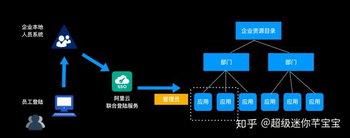 - 用户SSO:IT管理员同步本地人员登陆信息到阿里云,并在阿里云上创建用户组以及管理权限。